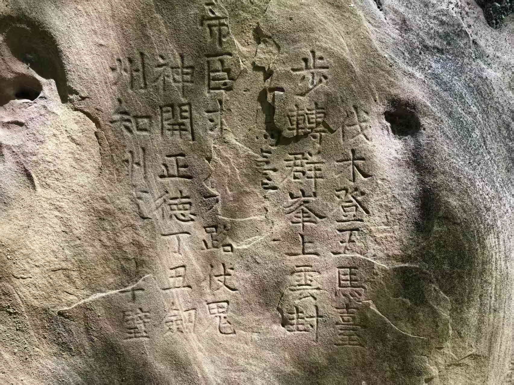 细细观看题刻上的内容,仍能大致分辨出其上的文字。据傅玉斌介绍,这是明正德十二年(1517年),时任剑州知州李璧书题的五言绝句诗,刻幅高80厘米,宽60厘米。其中,第二行“五马台”3字风化剥蚀严重,但从残存风化笔画依然可辨读。该诗第四行转句,“帝臣求●●”最后两字无法辨读,这块大石南侧还有二处楷书阴刻“五马台”“茶园沟在南三里”依稀可辨。